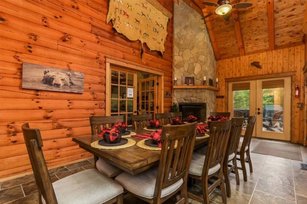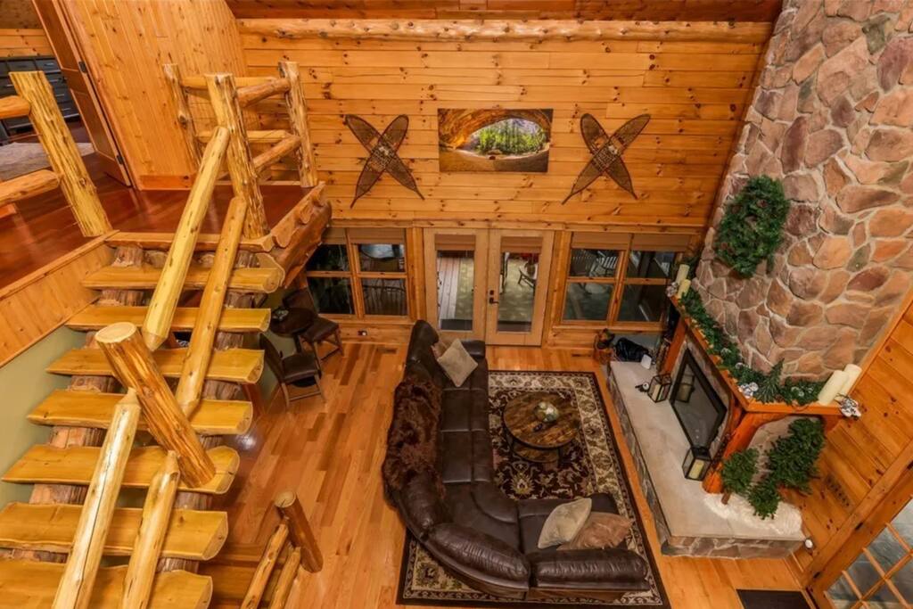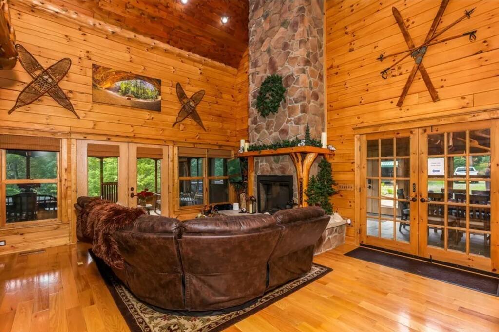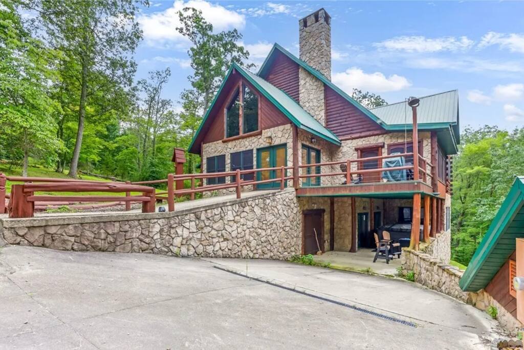 Welcome to another one-of-a-kind retreat by Living The Dream Cabins. This custom-built, Amish-crafted log lodge blends Yellowstone-inspired grandeur with modern luxury and thoughtful design. From the whole-tree log supports to the soaring ceilings and fireplaces throughout, every detail was created to impress while still feeling warm and welcoming. The lodge sits adjacent to state land with direct access to over 40 miles of Ohio’s most popular trails and is located next to Cowboy Larry’s Horse Camp, making it an ideal destination for hikers, horseback riders, and outdoor enthusiasts. The home spans 3 expansive levels and features 4 fireplaces throughout, offering plenty of space for large families or group getaways while still providing privacy and comfort. Main living spaces include a stunning great room with a soaring ceiling, electric fireplace, TV, and an open layout that connects to the fully stocked kitchen. Just off the main living area is a four-seasons room with a large dining table and a wood-burning fireplace, perfect for shared meals, celebrations, and cozy evenings together. Each level includes a private owner’s suite, for a total of 3 bedrooms and 3 full bathrooms, plus an additional half bath and an open loft sleeping area. The main level primary suite features a king bed, full bathroom with a shower, electric fireplace, TV, and a leather sofa that converts into an additional sleeping space. There is also a washer and dryer. The upper-level owner’s suite includes a king bed, full bathroom with shower, soaking tub, TV, Keurig, mini fridge, and a private balcony overlooking the property. The upper-level loft offers two full beds and provides a comfortable open sleeping space. The lower-level owner’s suite includes two queen beds and a trundle bed with one full and one twin mattress, a full bathroom with shower, and a dedicated desk/workspace. The lower level is also an entertainment hub, featuring a secret hidden game room with air hockey, foosball, and an Xbox, along with a pool table, ping pong table, wood-burning fireplace, and walk-out access to the covered patio. Outdoor living is just as impressive, with two open decks, a balcony, and a covered patio with seating. The dedicated grilling deck includes two grills, and the fire pit is surrounded by twinkle lights for unforgettable evenings. The covered patio also features a 12-person hot tub swim spa, perfect for relaxing after a day on the trails. For guests traveling with horses, on-site horse stalls are currently in development and are planned to be available beginning May 2026. Please note that this amenity is not yet available and timelines are subject to change. This lodge offers the rare combination of luxury craftsmanship, adventure-ready location, and resort-style amenities. Whether you’re planning a family gathering, group retreat, or outdoor-focused getaway, this is a destination cabin you’ll want to return to again and again.