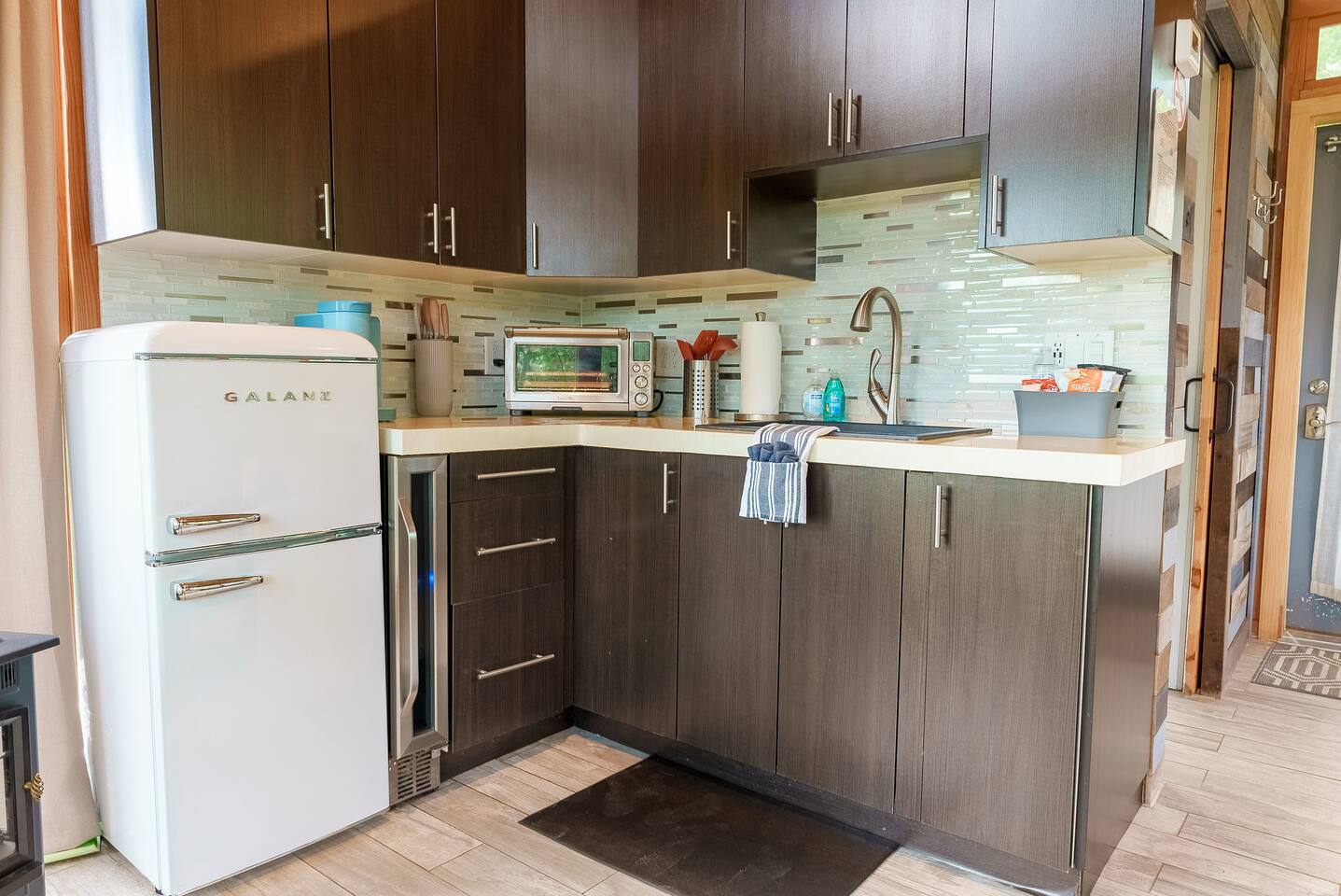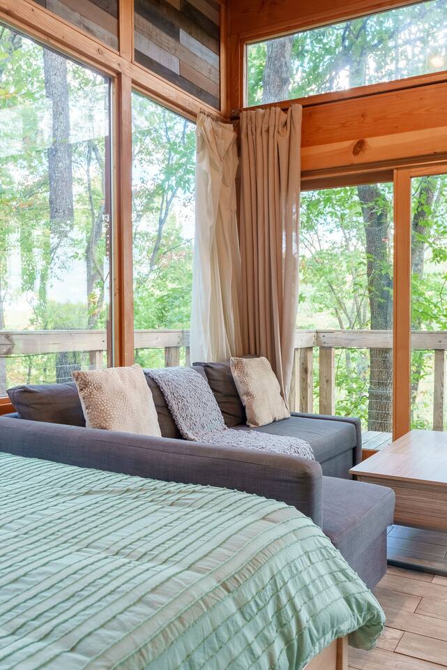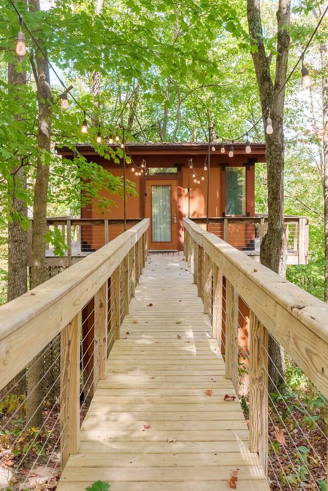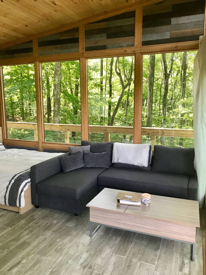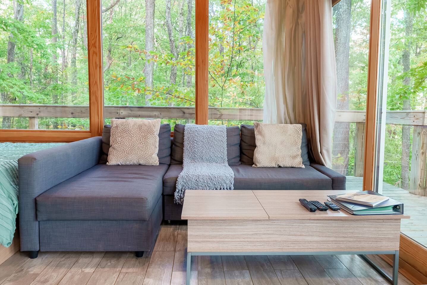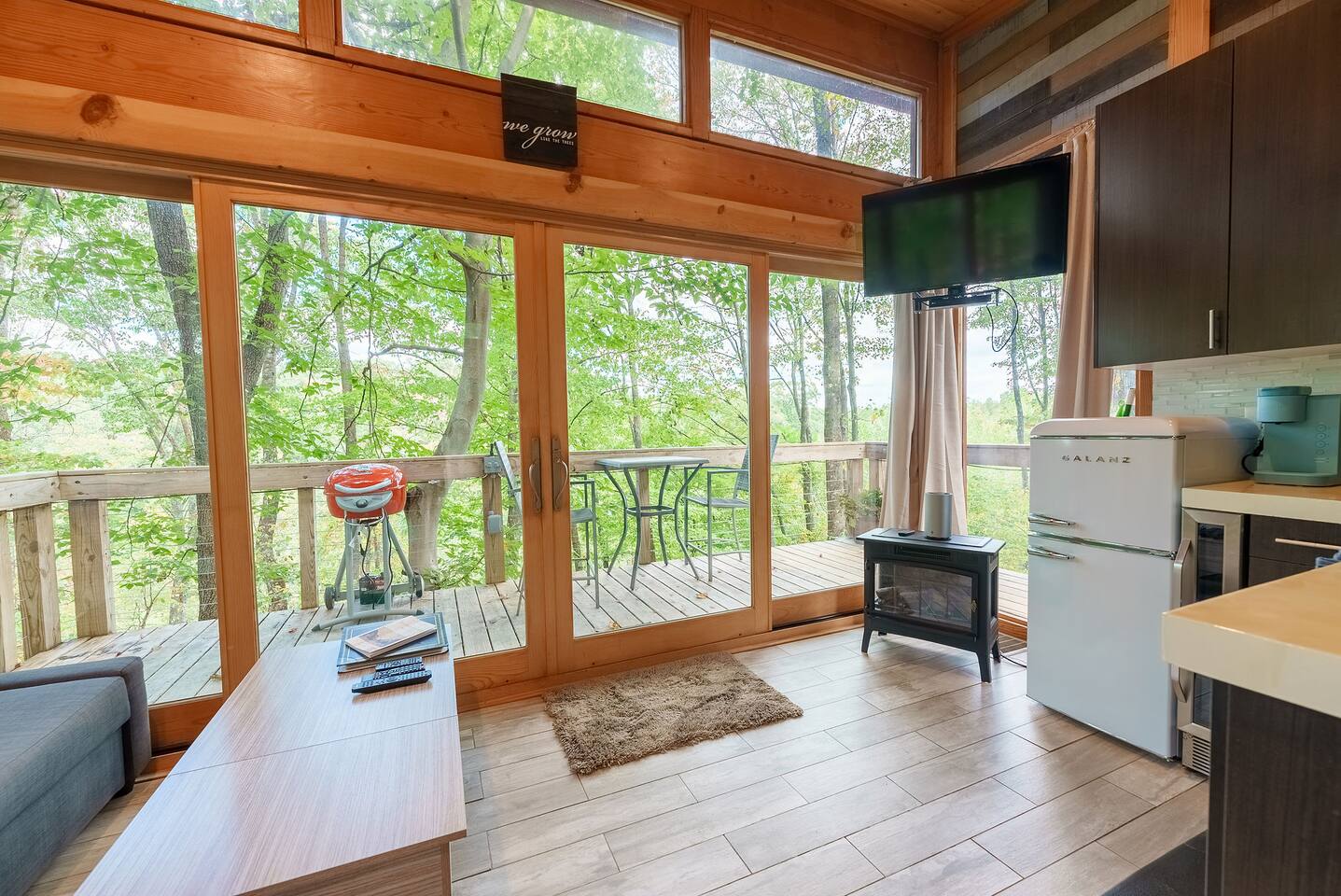 Escape to our cozy Treehouse retreat and fully immerse yourself into the beautiful scenery of Hocking Hills! This tiny home is studio-style, offering a queen bed and a foldout sofa for extra lounging space. Enjoy the comforts of full HVAC, fast Wi-Fi, and an electric fireplace for those chilly evenings. We also have a Bluetooth sound system with speakers built into the ceiling, a Smart TV to connect your streaming services, and a DVD player with a small collection of DVDs for your entertainment. When you're ready to unwind, step outside through the large sliding glass doors and enjoy a cup of coffee or glass of wine on our wraparound deck or relax around the fire pit under the twinkle lights! Tiny home = tiny kitchen! Our small but well-equipped kitchenette has two hot plates, pots, pans, a mini fridge and freezer, griddle, toaster oven, classic toaster, Keurig coffee maker, and all the utensils you need. There's even a 6-bottle wine cooler and an electric grill on the deck for outdoor cooking. While we don't have a traditional oven, microwave, or dishwasher, most guests still manage to prepare delicious meals without a hitch! Our treehouse also features a full bathroom with a toilet, shower, and a small vanity. The window offers privacy with just the flip of a switch, creating the perfect blend of nature and comfort. Perfect for a peaceful escape or a romantic getaway! Please send us a message if you have any questions about the Treehouse or any of our other properties. More pictures and videos can be found on our social media pages: - FB: Living the Dream Cabins - IG: @livingthedreamcabins