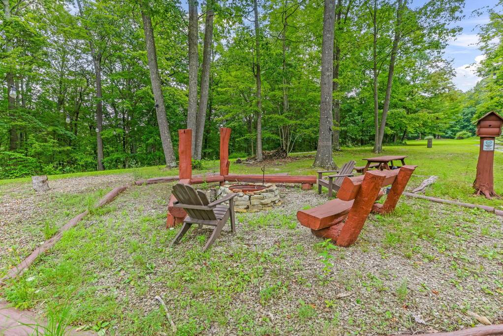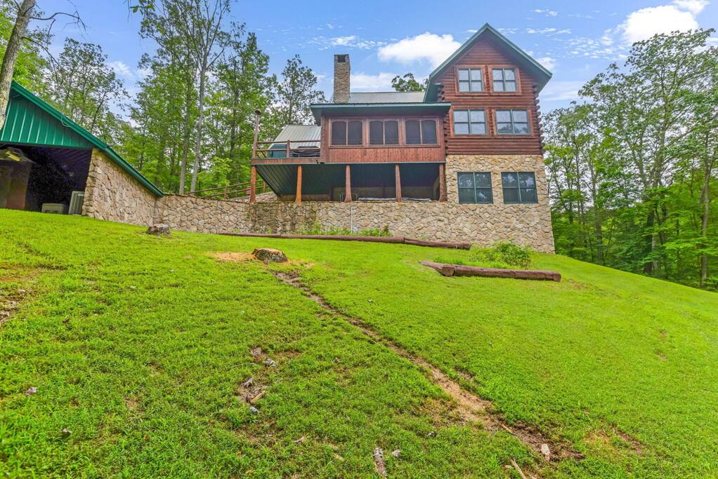 Welcome to another one-of-a-kind retreat by Living The Dream Cabins. This custom-built, Amish-crafted log lodge blends Yellowstone-inspired grandeur with modern luxury and thoughtful design. From the whole-tree log supports to the soaring ceilings and fireplaces throughout, every detail was created to impress while still feeling warm and welcoming. The lodge is over 4,000 sq. ft. on almost 8 private acres and sits adjacent to state land with direct access to over 40 miles of Ohio’s most popular trails and is located next to Cowboy Larry’s Horse Camp, making it an ideal destination for hikers, horseback riders, and outdoor enthusiasts. The home spans 3 expansive levels and features 4 fireplaces throughout, offering plenty of space for large families or group getaways while still providing privacy and comfort. Main living spaces include a stunning great room with a soaring ceiling, electric fireplace, TV, and an open layout that connects to the fully stocked kitchen. Just off the main living area is a four-seasons room with a large dining table and a wood-burning fireplace, perfect for shared meals, celebrations, and cozy evenings together. Each level includes a private owner’s suite, for a total of 3 bedrooms and 3 full bathrooms, plus an additional half bath and an open loft sleeping area. The main level primary suite features a king bed, full bathroom with a shower, electric fireplace, TV, and a leather sofa that converts into an additional sleeping space. There is also a washer and dryer. The upper-level owner’s suite includes a king bed, full bathroom with shower, soaking tub, TV, Keurig, mini fridge, and a private balcony overlooking the property. The upper-level loft offers two full beds and provides a comfortable open sleeping space. The lower-level owner’s suite includes two queen beds and a trundle bed with two twin mattresses, a full bathroom with shower, and a dedicated desk/workspace. The lower level is also an entertainment hub, featuring a secret hidden game room with air hockey, foosball, and an Xbox, along with a pool table, ping pong table, wood-burning fireplace, and walk-out access to the covered patio. Outdoor living is just as impressive, with two open decks, a balcony, and a covered patio with seating. The dedicated grilling deck includes two grills, and the fire pit is surrounded by twinkle lights for unforgettable evenings. The covered patio also features a 12-person hot tub swim spa, perfect for relaxing after a day on the trails. For guests traveling with horses, on-site horse stalls are currently in development and are planned to be available beginning May 2026. Please note that this amenity is not yet available and timelines are subject to change. This lodge offers the rare combination of luxury craftsmanship, adventure-ready location, and resort-style amenities. Whether you’re planning a family gathering, group retreat, or outdoor-focused getaway, this is a destination cabin you’ll want to return to again and again.